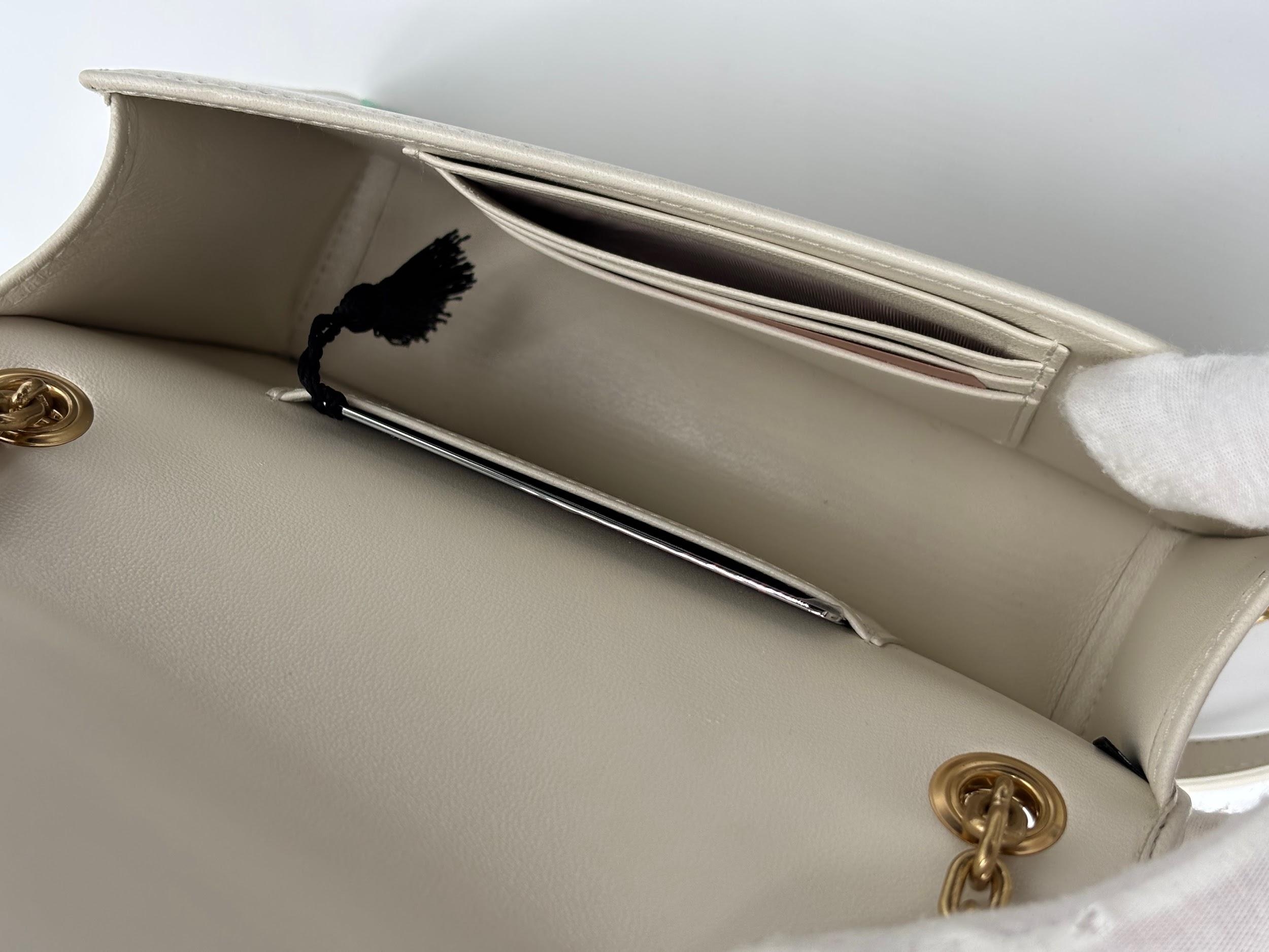 Realizată din piele moale de miel, în nuanța elegantă Bianco, este completată de lanțul dublu detașabil și logo-ul metalic Miu Miu aplicat frontal.