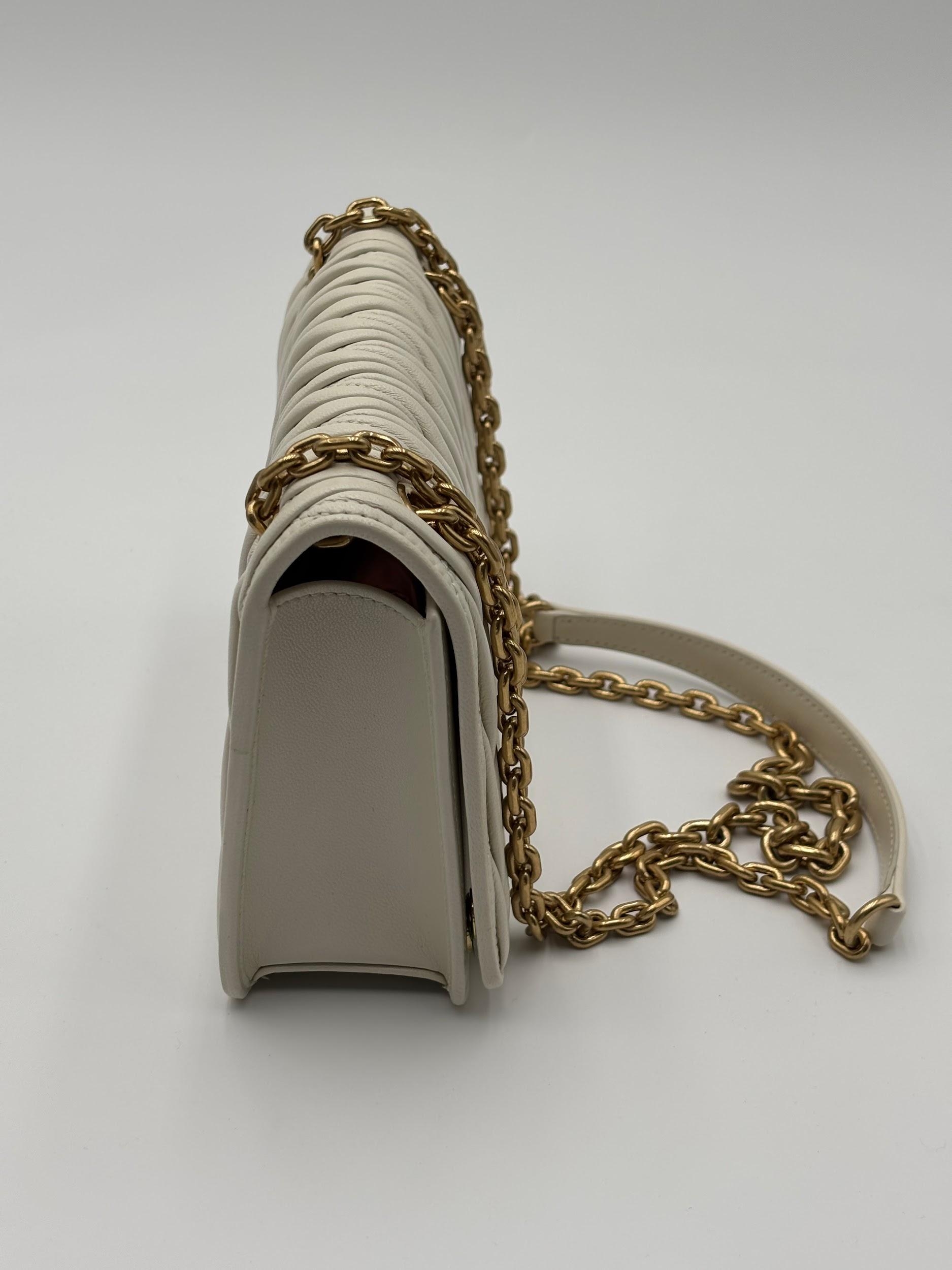 Rafinament și feminitate într-o formă compactă — această geantă Miu Miu Matelassé Mini impresionează prin textura tridimensională a pielii matlasate și accentele metalice aurii.